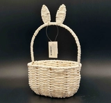 Милий декоративний кошик у білому кольорі з овальною основою та високою ручкою, прикрашеною парою «кролячих» вушок. Плетений із паперу на міцному металевому каркасі, виглядає акуратно й легкий на вагу.