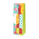 Яскравий паперовий пакет для пакування пляшки з кольоровим принтом у стилі поп-арт: силуети пляшки та келиха на контрастному тлі. Вертикальна форма і щільний папір забезпечують охайний вигляд подарунка. Зручні шнуркові ручки дозволяють комфортно переносити.